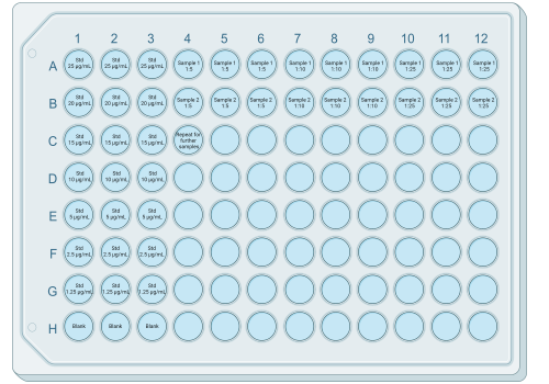 - Add 150 μL of sample or standard to each well following Figure 1. Avoid bubbles by only pipetting to the first stop.